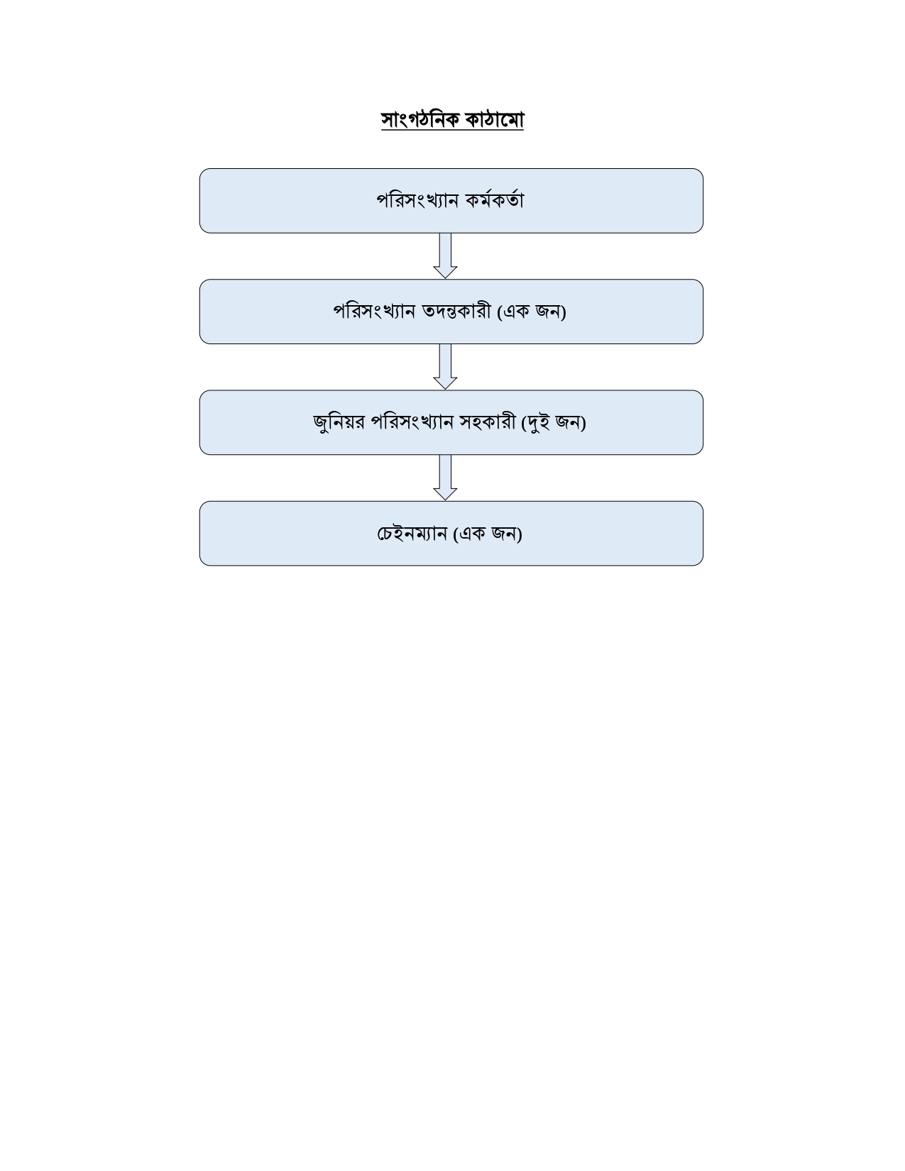 বাংলাদেশের জাতীয় পরিসংখ্যান সংস্থা হিসেবে বাংলাদেশ পরিসংখ্যান ব্যুরো (বিবিএস) ১৯৭৪ সালে প্রতিষ্ঠিত হয়। বাংলাদেশ পরিসংখ্যান ব্যুরো তার কাজকর্ম বাস্তবায়নের জন্য ঢাকা হেড অফিসসহ মাঠ পর্যায়ের বিভাগীয়, জেলা ও উপজেলা/মেট্টোপলিটন থানা পর্যায়ের অফিসগুলোর নেটওয়ার্ক স্থাপন করেছে। বর্তমানে বাংলাদেশের ০৮টি বিভাগে ০৮টি বিভাগীয় পরিসংখ্যান অফিস, ৬৪টি জেলায় ৬৪টি জেলা পরিসংখ্যান অফিস, ৪৮৩টি উপজেলা এবং ৬৯টি মেট্টোপলিটন থানা পরিসংখ্যান অফিসের শাখা বিস্তৃত। উপজেলা পরিসংখ্যান কর্যালয়ের অফিস প্রধান পরিসংখ্যান কর্মকর্তা। এ কর্যালয়ের মোট অনুমোদিত জনবল ৫(পাঁচ) জন। উপজেলা পরিসংখ্যান কার্যালয় বিশ্বম্ভরপুর, সুনামগঞ্জ এর সাংগঠনিক কাঠামোটি পেতে সংযুক্ত ফাইলটি ডাউনলোড করুন: